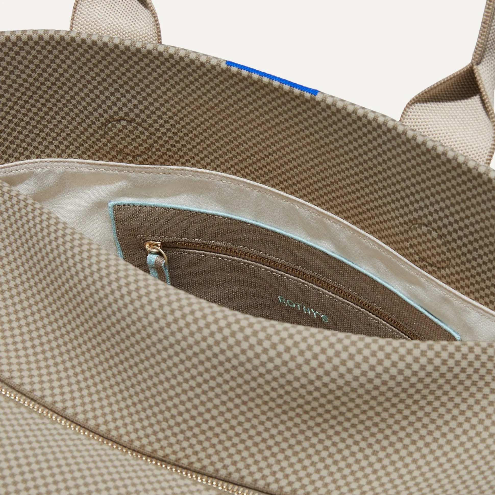 Our Durable, Spacious Travel Bag In A Brown And Cream Check Pattern With Minty Blue Accents Is Made For Getaways—With Three Roomy Compartments, Comfortable Top Handles And An Adjustable, Detachable Strap. Bonus: It Fits In The Overhead Bin Of Most Major Airlines.