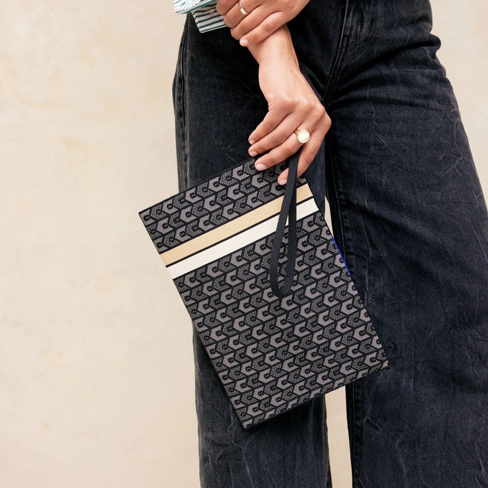 Sustainability Is Our Signature. Knit With A Unique Blend Of 100% Recycled Materials, Our Washable Wristlet In A Black And Graphite Logo Pattern Is A Functional Add-On To Any Style—Or Works As The Perfect On-The-Go Clutch.